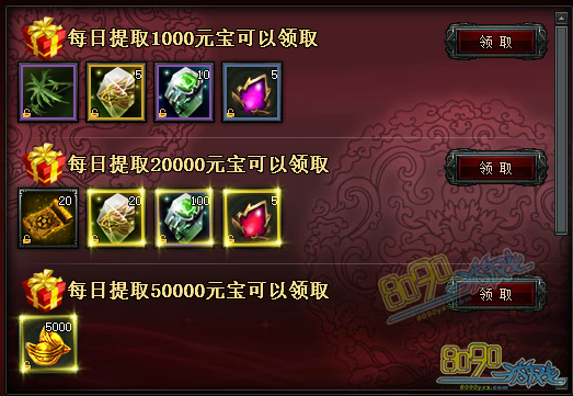 每日提取1000元宝以上可获得:杨柳枝*1,斩龙结晶*5,特戒结晶*10,经验玉(大)*5;每日提取20000元宝以上可获得:寻宝图*20,斩龙结晶*20,特戒结晶*100,经验玉(极品)*5;