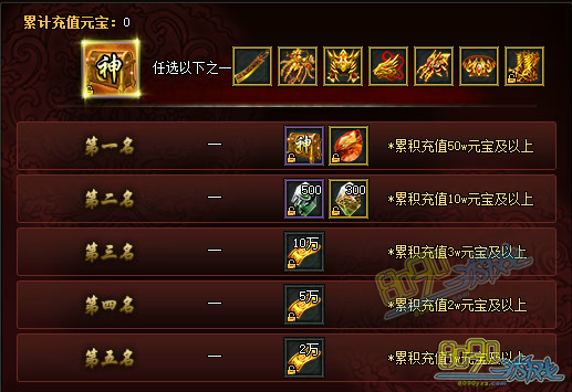 【活动内容】活动期间累计元宝充值排行前5名的玩家可获得丰厚道具奖励!