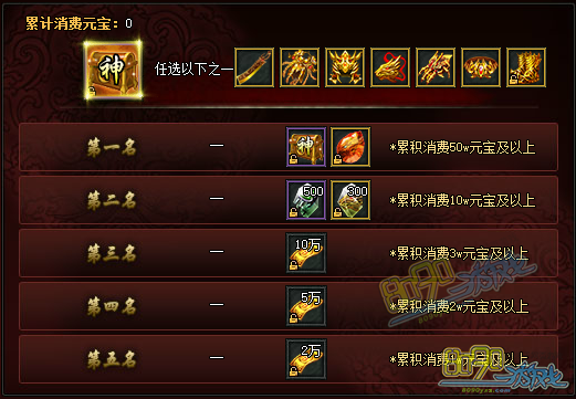【活动内容】活动期间累计元宝消费排行前5名的玩家可获得丰厚道具奖励!