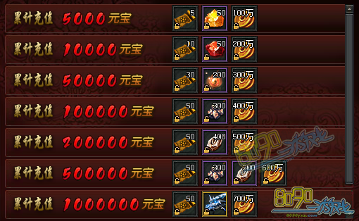 【活动内容】活动内容:活动期间,充值达到指定元宝即可获得相应道具奖励!(通过邮件发放)