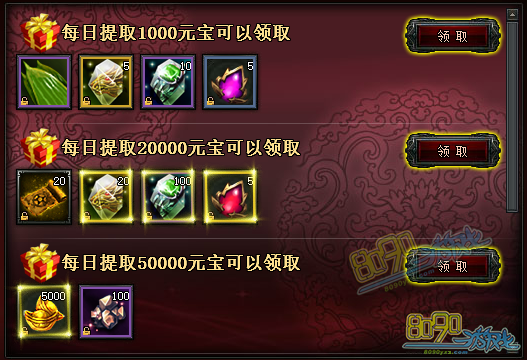 每日提取50000元宝以上可获得:5000元宝、九天玄铁*100;