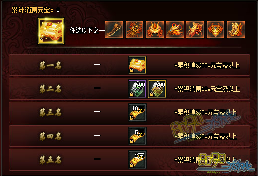 【活动内容】活动期间累计元宝消费排行前5名的玩家可获得丰厚道具奖励!