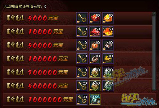 【活动内容】活动期间,充值达到指定元宝即可获得相应道具奖励!