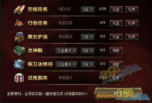 【活动内容】活动期间玩家可以通过活动界面使用元宝或礼券可立即完成每日所有任务、副本,轻松游戏,快乐过节!一键全秒,至尊便利!