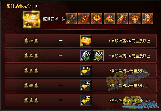【活动内容】活动期间累计元宝消费排行前5名的玩家可获得丰厚道具奖励!