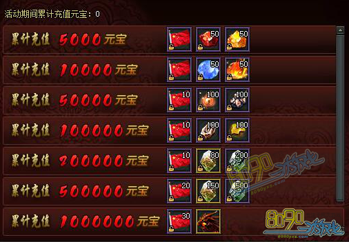【活动内容】活动期间,充值达到指定元宝即可获得相应道具奖励!(通过邮件发放)