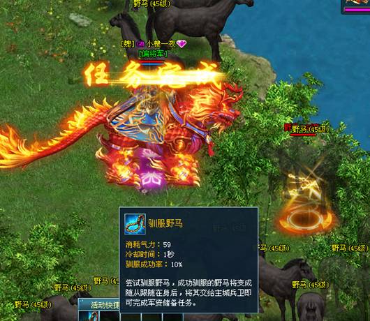 ② 跑到后,站定开始点击‘驯服野马’技能,就会有个马儿被你圈中,不过这时候它还没有被你驯服,技能的CD时间很短,所以不要停顿的按驯服键吧。