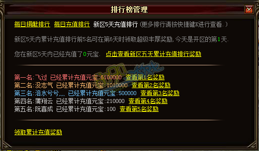 新区5天内累计充值排行前5名可在第6天领取超级丰厚奖励。可在九龙城npc“排行榜管理”处查看。