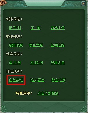 入口开启10分钟,10分钟之后关闭入口,正式计时30分钟,活动刷3轮BOSS,在入口开启的前10分钟游戏内都会有公告,所以不必担心会错过进入的时间。当血色祭坛开放时,玩家可以点击各大主城传送NPC进行传送,或是使用超级传送石传送进入。在血色祭坛副本中每分钟可以获得60000点经验,活动开始后血色祭坛里每10分钟刷新1个BOSS,共3次(不考虑当前地图BOSS有没打完)。活动结束,所有玩家将自动被传送至王城。 加群就免费送元宝和百万礼包,你还在等什么?战神传说官方交流群:133187167 |