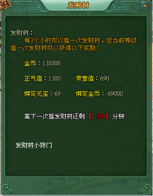 当发财树可以收获时,玩家会得到一个黄色的感叹号通知,点开这个感叹号点击立即收获就可以获得对话框中显示的奖励了。在收获的时候,我们可以使用一张招财神符来让这次的收获变为双倍。也可使用1W元宝来让发财树的生长时间缩短为2小时。当缩短为2小时后,我们还可以使用2W元宝来让发财树的生长时间缩短为1小时。这样你就能一小时获得一次丰厚的奖励,成为一颗名副其实的发财树了。 |