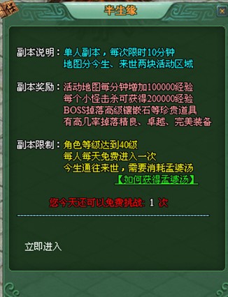 是VIP的同学,也别忘了领取每日福利。其次我们就是挑战boss了,不但有装备可以拿,还会掉落强化石,宝石等商城道具,何乐不为呢。半生缘也要记得去,一个怪25w经验比做任务划算多了,花元宝可以获得更多经验!至于来世什么的,我们普通玩家就算了,rmb玩家还是推荐去下,掉落极品装备。九重云霄也是必须去的,组上几个游戏里要好的朋友,一起打打本,聊聊天是多么愉悦的事。