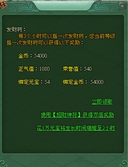 当玩家做完主线任务之后就可以开启发财树功能了,发财树的使用方法很简单,玩家只要累计在线3个小时就能收获一次发财树。当可以收获的时候玩家主界面没跳出黄色的感叹号。点击一下黄色的感叹号就能进入到收获界面。