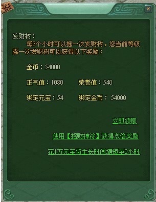 玩家也可以使用招财神符来领取双倍的奖励,也可以话费元宝来缩短发财树的生长时间,最少可以缩短至1小时哦。