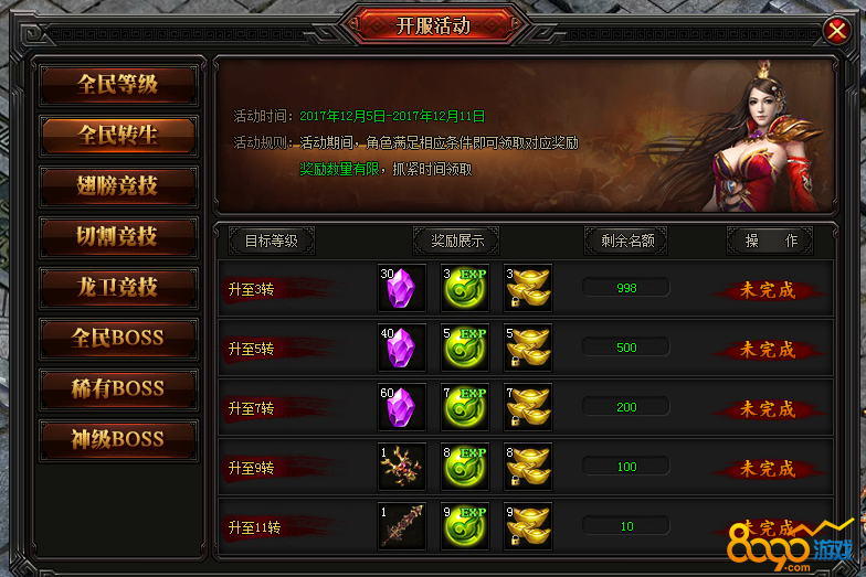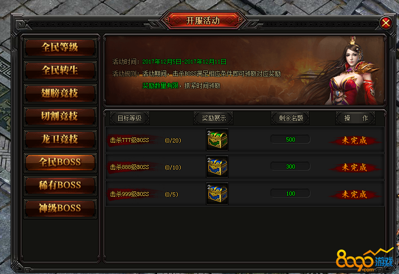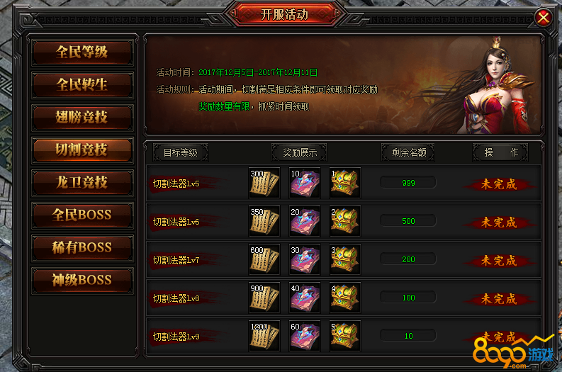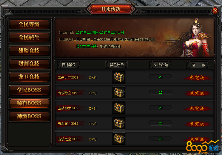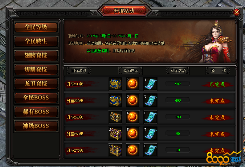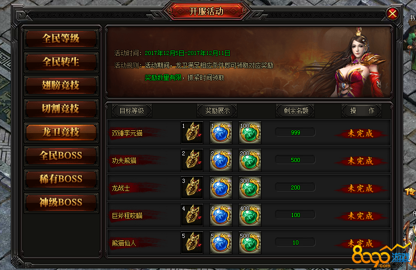 开服活动包括等级竞技、全名转生、翅膀竞技、切割竞技、龙卫竞技、全名BOSS、稀有BOSS、神级BOSS等精彩活动,各种丰厚奖励等你拿