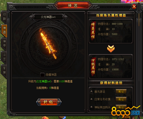 越强大的神器带来的属性加成会越多,想要体验神器带给你的无穷无尽的力量吗,快来游戏中升级神器吧。