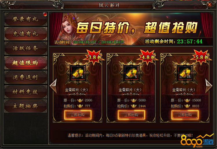 4. 超值限购:风云派对期间,每日会有特价商品登场,折扣力度极大,玩家可以轻松提升自身实力。