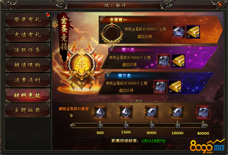 6. 材料竞技:活动期间内,使用金蚕碎片可获得稀有宝石赠送,使用排名靠前的玩家还可以获得高阶稀有宝石。