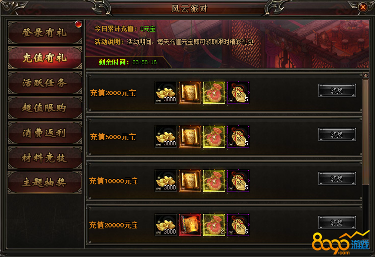 2. 充值有礼:风云派对期间,每天充值元宝可以获得对应充值量的奖励,有高阶八卦和藏宝图赠送。