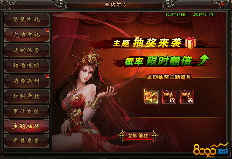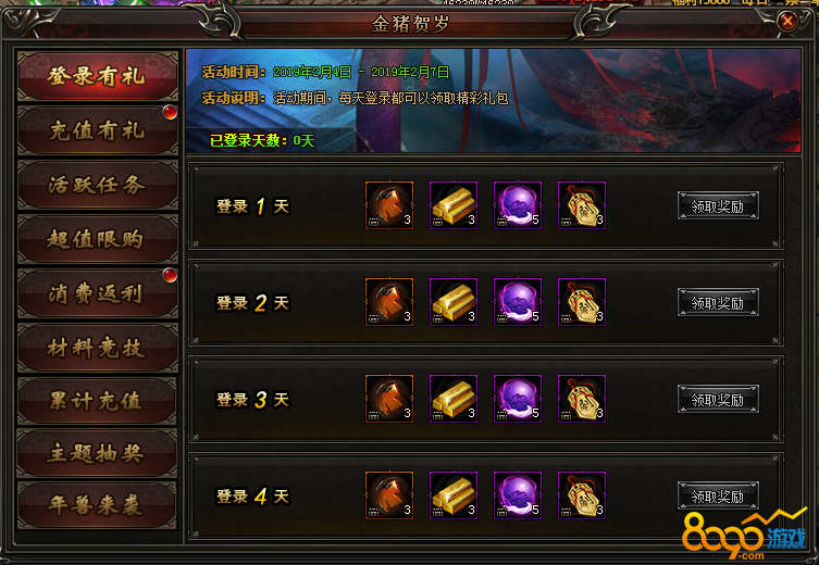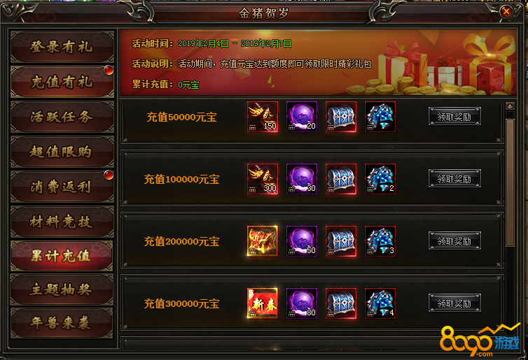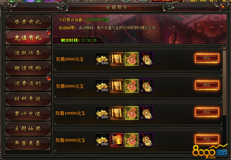 2. 充值有礼:金猪贺岁期间,每天充值元宝可以获得对应充值量的奖励,有高阶八卦和藏宝图赠送。