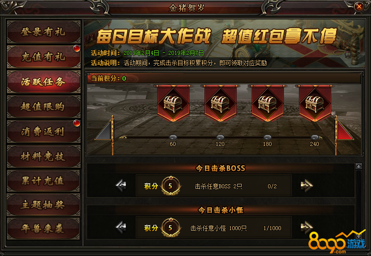 3. 活跃任务:每天完成目标任务可积累积分,积分达到要求值后,可以免费领取大量奖励。
