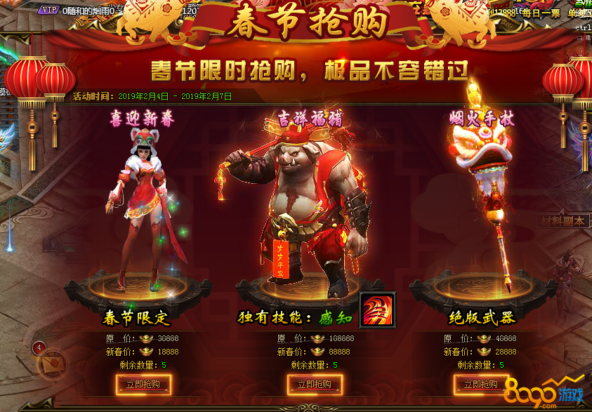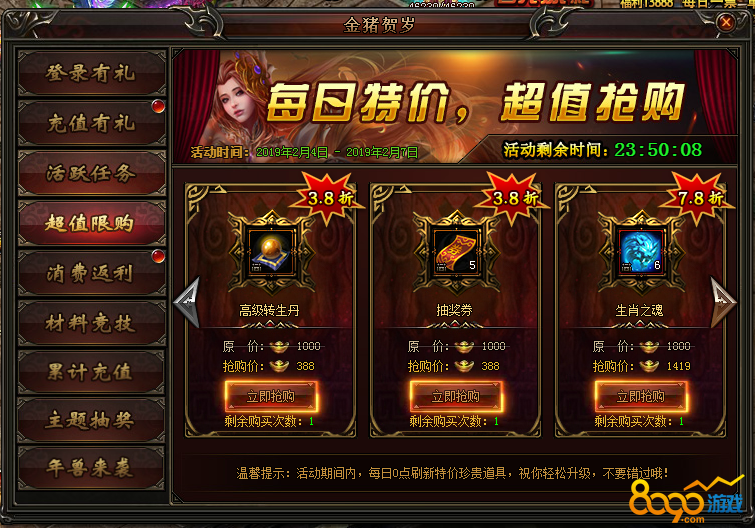 4. 超值限购:金猪贺岁期间,每日会有特价商品登场,折扣力度极大,玩家可以轻松提升自身实力。