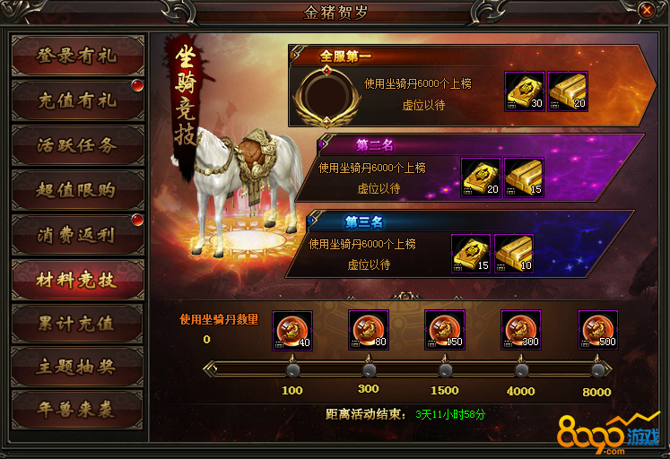 6. 材料竞技:活动期间内,使用坐骑丹可获得坐骑丹反还,排名靠前的玩家还可以获得坐骑技能数赠送。