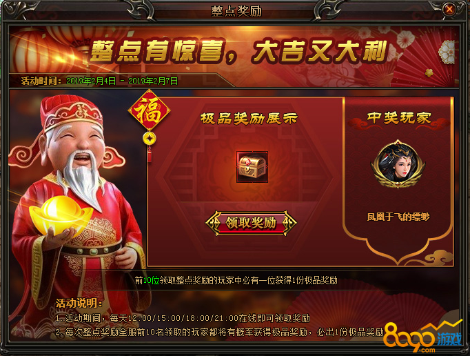 活动规则:活动期间,每天的12:00/15:00/16:00/21:00,可领取在线奖励,并且前10领取的玩家由概率得到极品奖励。