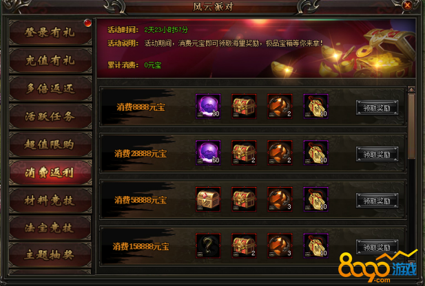 3. 多倍返还:活动期间,每天花费888元宝可购买超值材料,每日限购一次,购买的次数越多,奖励的倍率越高。