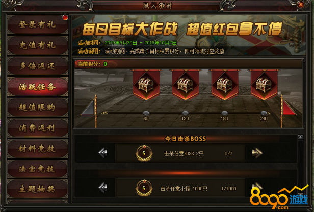 4. 活跃任务:每天完成目标任务可积累积分,积分达到要求值后,可以免费领取大量奖励。