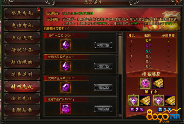 7. 材料竞技:活动期间内,使用木玺碎片达到一定数额可免费获得暴击宝石,排名靠前的玩家还可获得高阶暴击宝石。