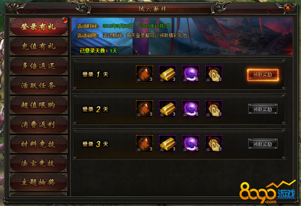 1. 登录有礼:活动期间内,每天登录游戏都可以免费领取奖励。
