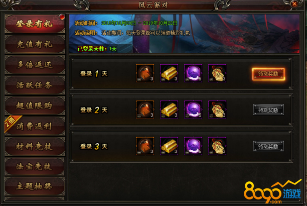 1. 登录有礼:活动期间内,每天登录游戏都可以免费领取奖励。