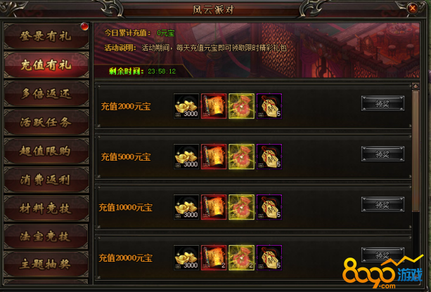 2. 充值有礼:活动期间,每天充值元宝可以获得对应充值量的奖励,有高阶八卦和藏宝图赠送。