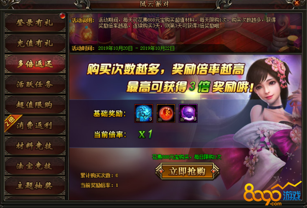 3. 多倍返还:活动期间,每天花费888元宝可购买超值材料,每日限购一次,购买的次数越多,奖励的倍率越高。