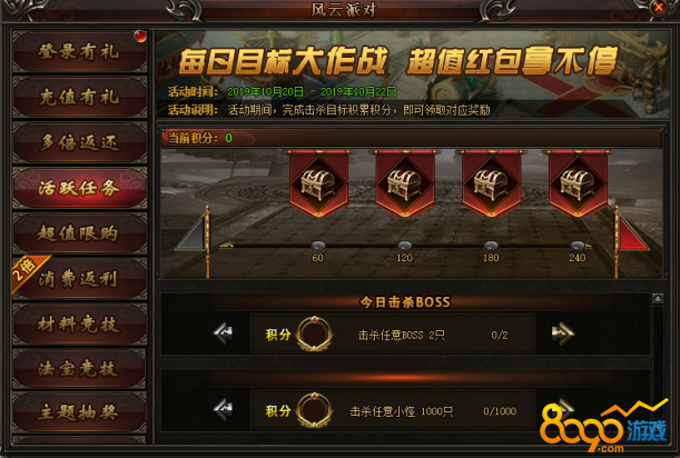 4. 活跃任务:每天完成目标任务可积累积分,积分达到要求值后,可以免费领取大量奖励。
