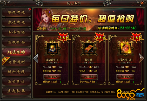 5. 超值限购:活动期间,每日会有特价商品登场,折扣力度极大,玩家可以轻松提升自身实力。