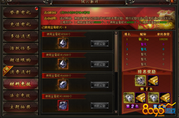7. 材料竞技:活动期间内,使用金蚕碎片达到一定数额可免费获得暴击减伤宝石,排名靠前的玩家还可获得高阶暴击减伤宝石。