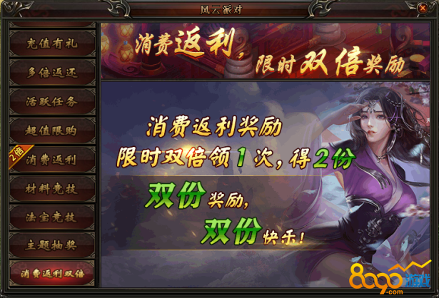 11. 双倍消费返利:活动期间,消费返利奖励限时双倍,每次领奖可获得2份奖励