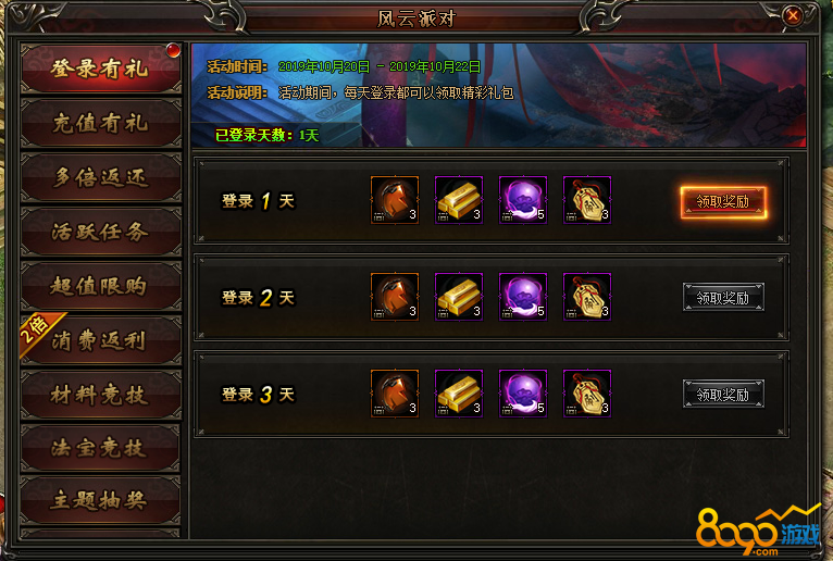 1. 登录有礼:活动期间内,每天登录游戏都可以免费领取奖励。