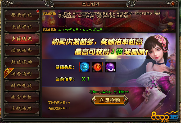 3. 多倍返还:活动期间,每天花费888元宝可购买超值材料,每日限购一次,购买的次数越多,奖励的倍率越高。