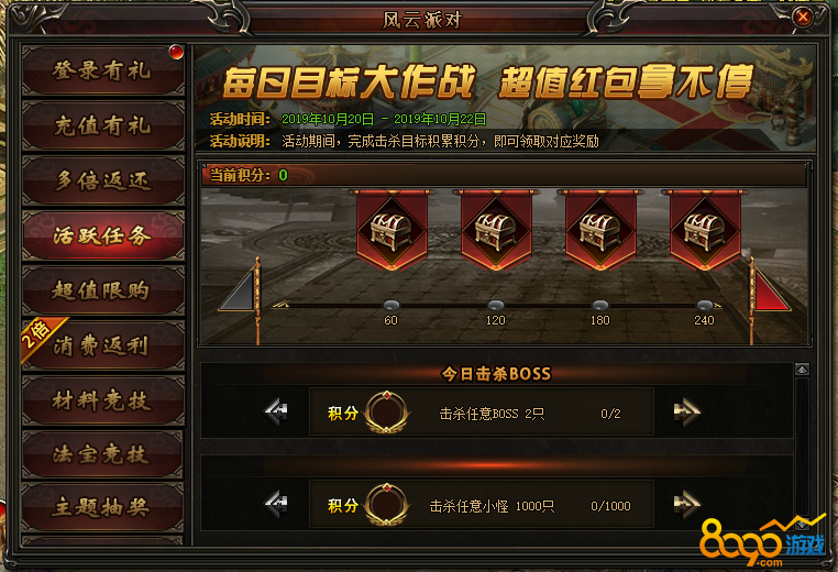 4. 活跃任务:每天完成目标任务可积累积分,积分达到要求值后,可以免费领取大量奖励。