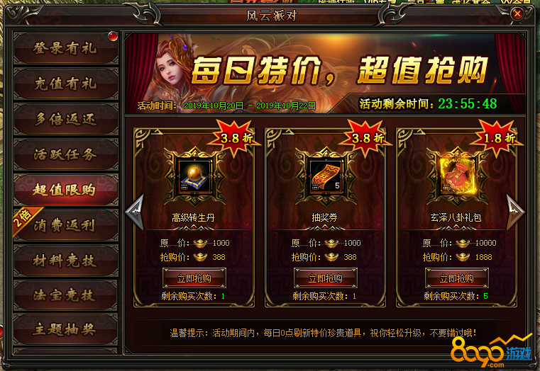 5. 超值限购:活动期间,每日会有特价商品登场,折扣力度极大,玩家可以轻松提升自身实力。
