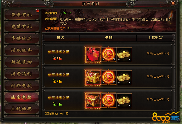 8. 图腾法宝竞技:活动期间内,使用图腾之灵达到指定数额即可荣登排行榜,最终的上榜玩家可获得极品奖励。