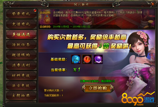 3. 多倍返还:活动期间,每天花费888元宝可购买超值材料,每日限购一次,购买的次数越多,奖励的倍率越高。
