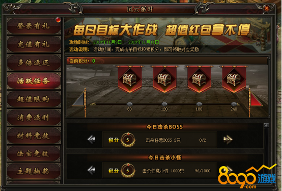 4. 活跃任务:每天完成目标任务可积累积分,积分达到要求值后,可以免费领取大量奖励。