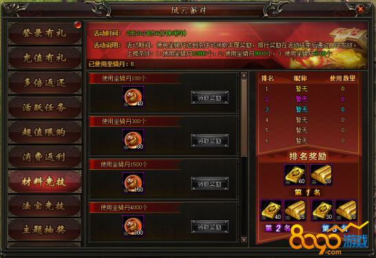 7. 材料竞技:活动期间内,使用坐骑丹达到一定数额可免费获得坐骑丹,排名靠前的玩家还可获得坐骑技能书。