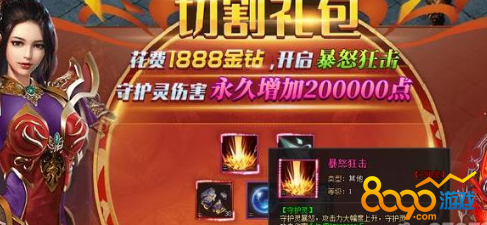 切割礼包花费1888金钻就可以开启暴怒狂击,守护灵暴怒,攻击力大幅度上升,守护灵攻击伤害永久增加200000点。对任意守护灵使用期间,使用后会对所有守护灵生效。