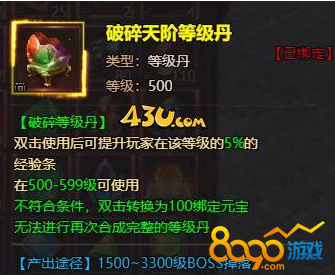 前期怪物就能掉落等级丹,但是随着等级的提高,等级丹的掉率会变低。不过,虽然完整的等级丹掉率很低,但是残破的等级丹掉率相对大很多。一颗残破的等级丹,可以提升当前经验条的5%。