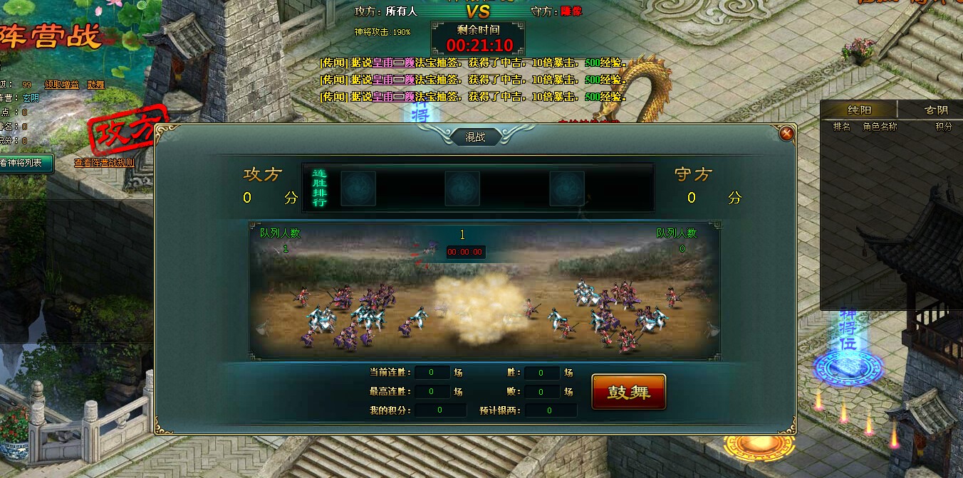 2.每次攻击根据胜负,玩家获得银两、经验奖励和排名积分,同时阵营获得和积分等额的神将召唤的;