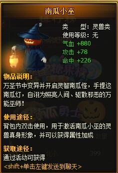 活动说明:活动期间,开启南瓜宝藏活动,玩家可以探宝获得大量稀有道具以及活动道具。更有几率获得可合成万圣节专属灵兽-南瓜小巫 所需的合成道具“南瓜灯”。